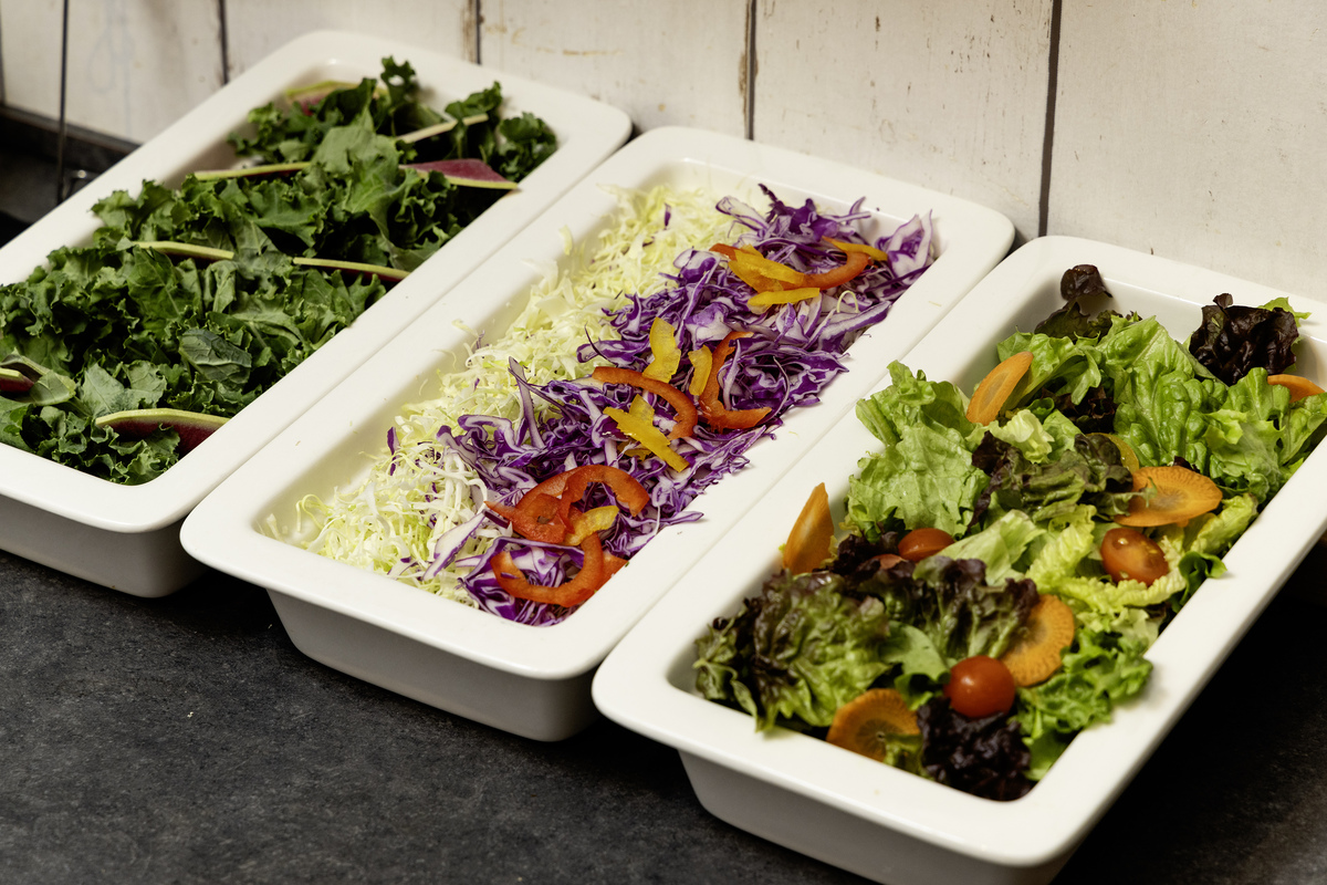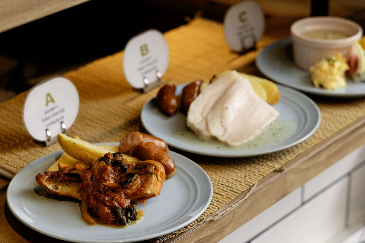 メインディッシュに加え、日替わりデリ、サラダバー、スープ、ソフトドリンクをご用意しております。特製の味噌玉を使ったお味噌汁も自由にお作りいただけます。お好みの組み合わせで、彩り豊かなお食事をお楽しみください。